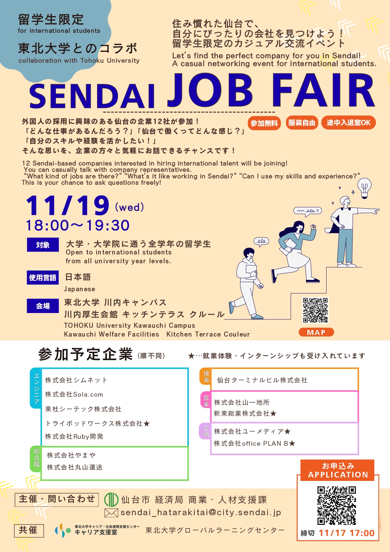 12 Sendai-based companies which are interested in hiring international talent, want to talk with you on this networking event on Nov 19!